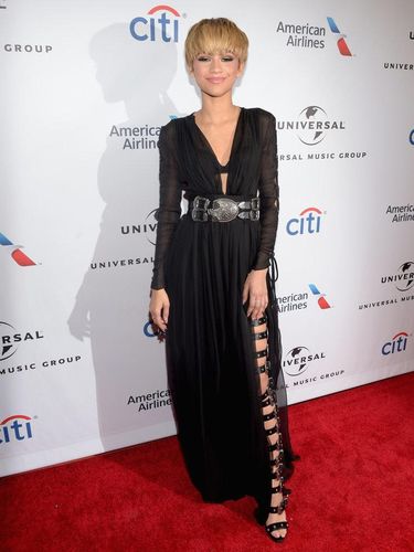 Penampilan afterparties Zendaya tampaknya lebih menarik dari busana utamanya di Grammy. Setelah sebelumnya tampil maskulin dengan setelan, kali ini Zendaya memakai gaun hitam high-slit dan sepatu aksen sabuk yang mencuri perhatian di antara kerumunan pesta.