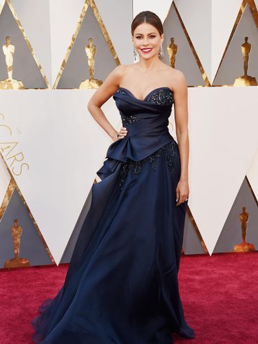 Bintang 'Modern Family' ini tampil classy dan elegan dalam balutan gaun strapless satin biru gelap bersiluet A. Penampilannya kian elegan berkat sepasang anting chandelier yang menghiasi telinganya.