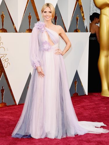 Gaun bersiluet longgar yang berwarna lilac Marchesa dari koleksi Fall-Winter 2016 menjadi pilihan supermodel Heidi Klum. Berbahan tulle, gaun one-shoulder itu juga dipercantik dengan hiasan korsase yang menginjeksikan kesan feminin pada gayanya.