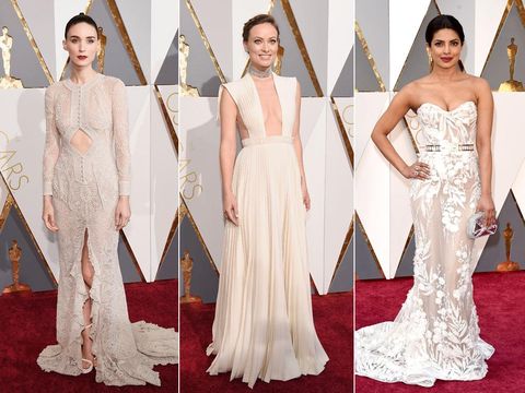Gaun putih tak hanya memikat ketika dipakai di altar namun juga karpet merah ajang bergengsi, dan kali ini menjadi tren di Oscar. Sejumlah selebriti yang tampil dalam balutan gaun putih elegan adalah Lady Gaga dengan gaun Brandon Maxwell, gaun lipit Olivia Wilde dari Valentino, Priyanka Chopra dengan Zuhair Murad hingga gaun Givenchy yang dipakai Rooney Mara.