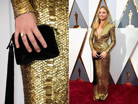 Bintang The Suicide Squad menambahkan sedikit kesenangan untuk gaun sequin emas dari Tom Ford dengan clutch hitam yang unik. Clutch berbentuk klasik warna hitam itu tampil berbeda karena memiliki ornamen tassel atau rumbai panjang di bagian resletingnya. Aksesori satu ini datang dari label milik Mary-Kate dan Ashley Olsen, The Row.