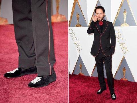Dalam balutan setelan hitam, Jared Leto mengeluarkan sisi eksentriknya di karpet merah Oscar ke-88. Bukan hanya garis jahitan warna merah yang kontras dengan korsase bunga yang memikat mata penikmat mode, melainkan sepatu loafers berbahan velvet yang ia pakai. Sepatu dari Gucci ini semakin menarik dengan bordiran bergambar ular dan berhias kristal.