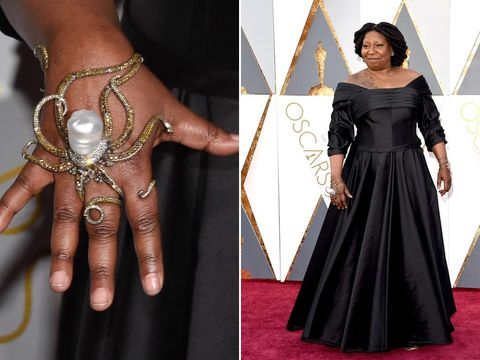 Whoopi Goldberg melengkapi gaun hitam Dames of New York dengan banyak detail unik dari pilihan aksesorinya. Tapi tak ada yang lebih mencuri atensi dibanding cincin bentuk gurita besar yang memenuhi jarinya dengan berlian dan mutiara besar. Orang kreatif di balik cincin ini adalah desainer asal Istanbul bernama Sevan Bicakci.