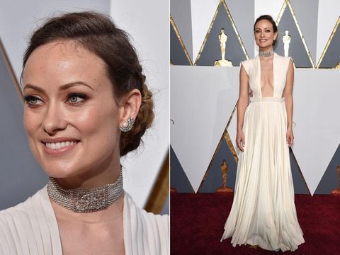 Olivia Wilde menyempurnakan gaun dengan plunging neckline dari Valentino dengan aksesori yang sempurna, yakni choker dan anting mutiara senada. Anting mutiara itu datang dari desainer perhiasan Edwardian, sedangkan choker platinum dan berliannya adalah Neil Lane.