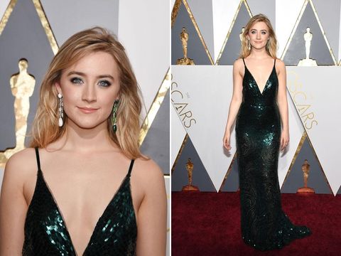 Saoirse Ronan tak salah memilih anting, melainkan tampil berani dengan memilih warna anting berbeda di kanan dan kirinya. Anting yang terdiri dari batuan kristal, mutiara dan emerald ini adalah kreasi dari Chopard, yang tampil senada dengan gaun hijau Calvin Klein Collection miliknya.