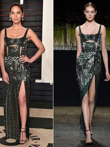 Olivia Munn mengganti gaun one shoulder oranye dari Stella McCartney yang terkesan minimalis dengan gaun edgy penuh tekstur dan kilau rancangan J. Mendel. Koleksi terbaru dari desainer Gilles Mendel ini ditampilkan perdana ketika New York Fashion Week di pertengahan Februari lalu, dan kini sudah dipakai oleh aktris yang bermain di film The Newsroom.