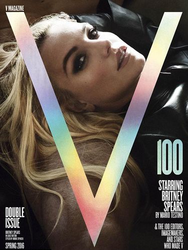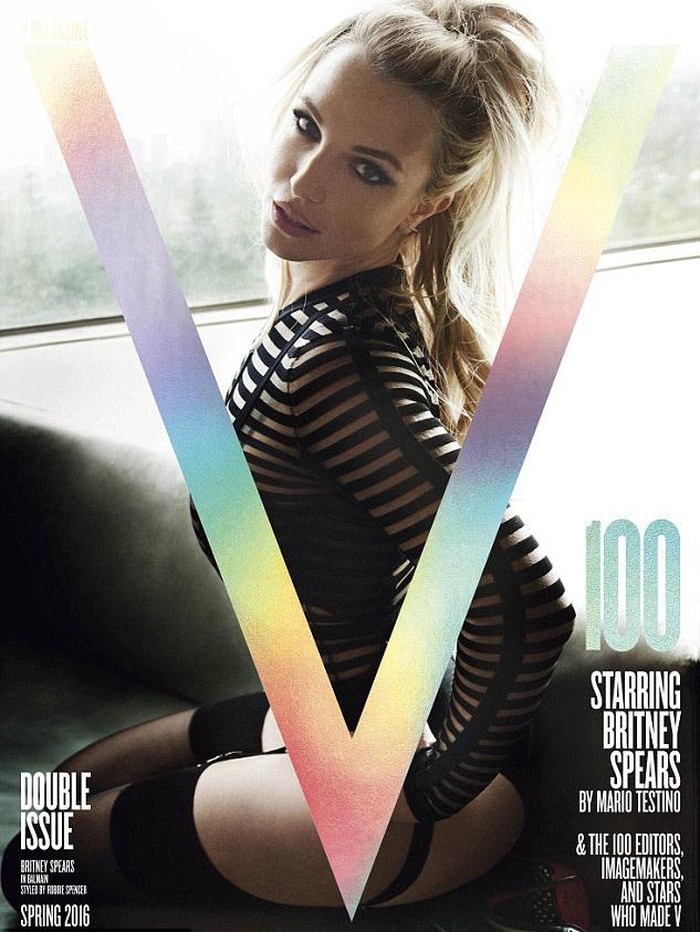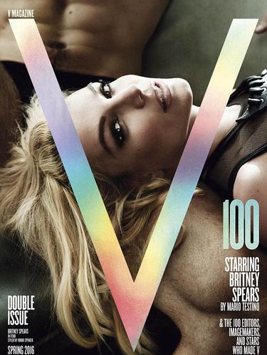 Bintang 34 tahun itu berpose seduktif dalam balutan busana transparan dan foto berbalut lingerie untuk merayakan edisi ke-100 majalah V. Imej baru kali ini pun diabadikan oleh fotografer ternama di industri mode, Mario Testino. Britney juga berpose dengan seorang pria dan tidur di pangkuan model itu.