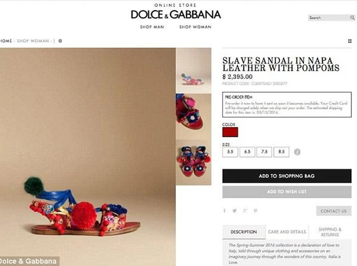 Brand Italia Dolce & Gabbana menjadi kontroversi karena produk yang dirilis di situs mereka. Produk berupa sepasang sandal itu dinamai slave sandals. Protes pun membanjiri akun media sosial Dolce & Gabbana.