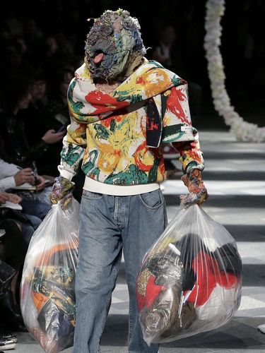 Perhiasan di wajah adalah fitur kunci dengan satu model menyeret dua kantung sampah besar berisi pakaian di runway. Wajahnya tertutup oleh berbagai jenis kain, seolah menjadi kritikan kepada konsumerisme industri mode. Sementara model lainnya bergaya lebih glamor dengan logam dan manik-manik di wajah dan baju.