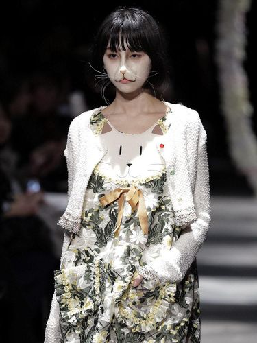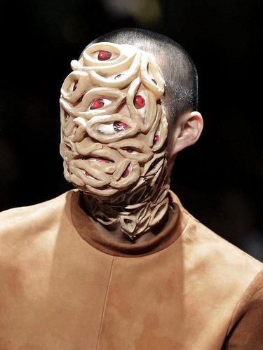 Kenalkan Yoshikazu Yamagata, desainer di balik konsep fashion show yang mengejutkan ini. Pria yang mempelajari mode di Central Saint Martins, London melanjutkan tema mutan untuk labelnya, writtenafterwards dan mengirim para model berjalan dengan wajah tertutup bola mata, paruh burung gagak, kepala ayam dan mulut kucing.