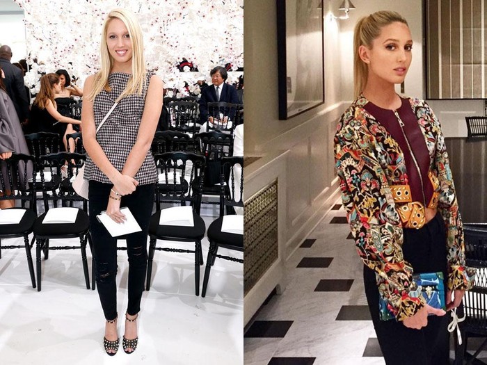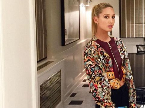 Maria menjadi fashionista pertama yang mengenakan koleksi Louis Vuitton Resort 2016. Paduan antara jaket bomber penuh motif dengan clutch box biru cerah membuatnya tampil unik namun tetap terlihat elegan.