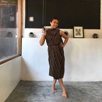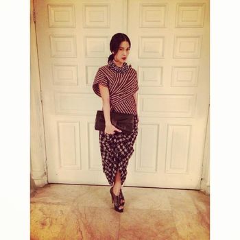 Aktris 2 anak ini mengombinasikan lurik dengan batik kontemporer yang cocok dikenakan saat ingin pergi ke pesta atau menghadiri acara formal. Ia melengkapi penampilannya dengan aksesori berupa kalung bulat berukuran besar serta clutch bag yang senada dengan busananya.