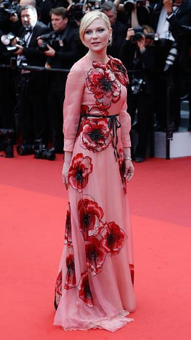 Bentuk bunga poppy di bordir di atas kain chiffon bernuansa merah muda menghadirkan dimensi pada gaun serta kesan romantis nan feminin dari koleski Gucci yang dibuat khusus untuk Kirsten Dunts. Aplikasi pita hitam di pinggang tak hanya memberi siluet namun membuat gaun seolah datang dari dunia mimpi. (asf/asf)