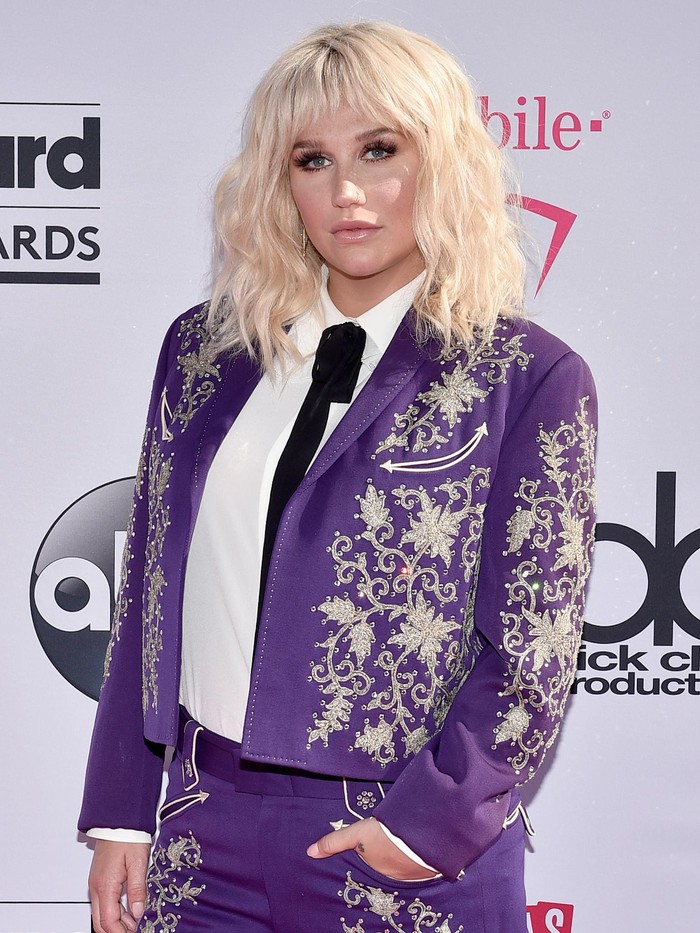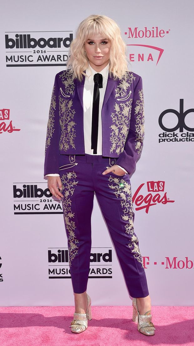 Sebelum naik pentas, wanita 29 tahun ini melangkah dan berpose di hadapan puluhan fotografer di karpet pink BBMA. Kesha mengenakan setelan ungu terong bergaya matador lengkap dengan slim tie hitam. Dengan gaya tersebut, ia seolah ingin menunjukkan dirinya sebagai sosok wanita yang tangguh meski dirundung berbagai macam masalah.