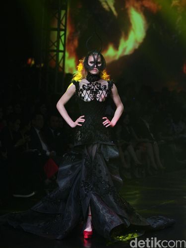 Sekuen kedua juga sama menawarkan gaun panjang atau ballgown mewah. Namun kali ini dituangkan dalam warna hitam yang lebih misterius nan elegan. Disertai headpiece tanduk ala Maleficent karya Rinaldy A. Yunardi yang dramatis. Beberapa gaun tampak klasik dengan korset memeluk tubuh dan bagian rok mullet yang memanjang ke belakang.