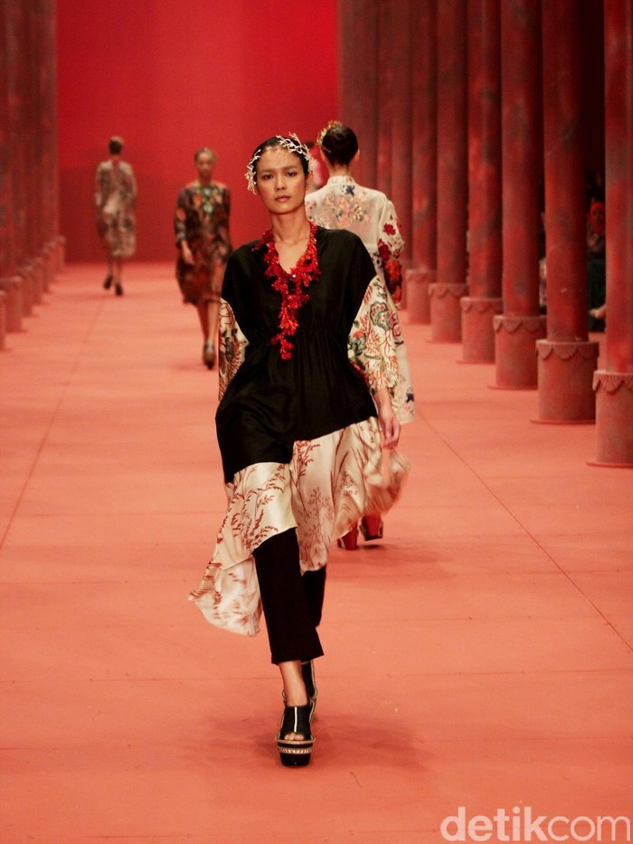 "I want to do more colors," kata desainer asal Surabaya, Jawa Timur ini. Hampir setiap gaun memakai banya warna yang kontras dan tampak mendominasi, seperti merah, coral, biru indigo, hijau mint, hijau zaitun, dipadu dengan off white, beige, emas, perak, dan hitam sebagai penyeimbang.