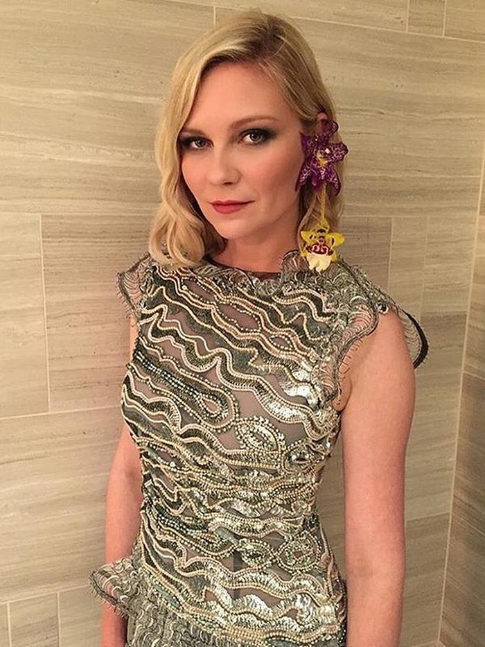 Kirsten memakai anggrek di salah satu telinganya. Ia membuat bunga itu tampil menarik atensi di antara model rambut bergelombang ala bintang klasik Hollywood. Aktris 34 tahun itu juga tampil dengan riasan mata smokey dengan lipstik raspberry yang tampak misterius.