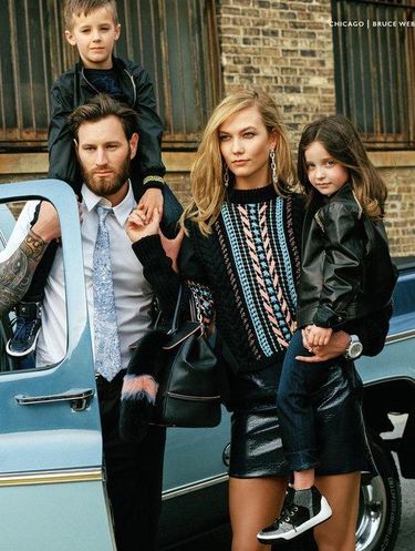 Foto lainnya menghadirkan Karlie berpose sambil menggendong seorang anak perempuan. Di sebelah model 23 tahun itu, tampil model pria yang berperan sebagai suaminya memanggul bocah lelaki. Mereka semua terlihat seperti keluarga kecil yang bahagia dan harmonis.