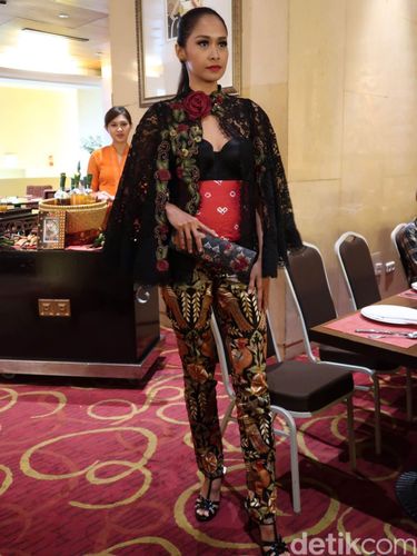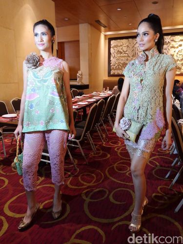 Selain menawarkan kebaya berwarna hitam yang glamour, ada pula koleksi batik cap dalam warna cerah. Tampilan batik terlihat feminin dan kekinian ketika disandingkan bersama atasan dan celana brokat.