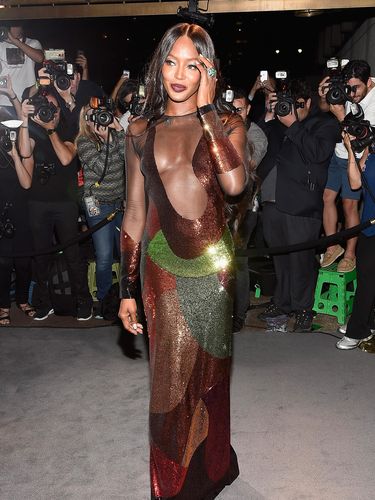 Naomi memilih gaun ber-glitter dengan aksen transparan yang mengekspos dadanya. Super seksi! Supermodel berdarah Inggris ini terlihat memiliki kulit berkilau yang makin tampak segar dengan pulasan lipstik marun.