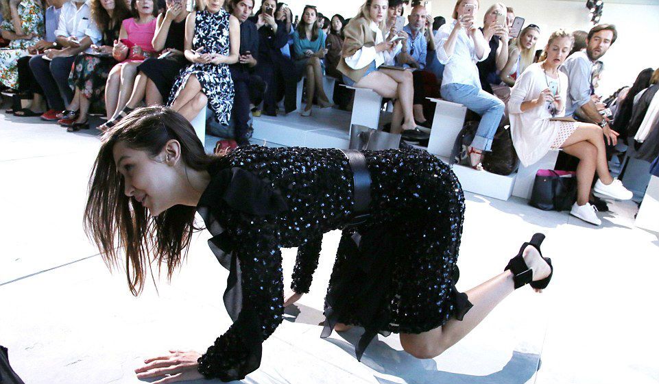 Malam itu adik Gigi Hadid ini memakai gaun bergaya retro yang tertutup sequin dan ruffle hitam dari koleksi Spring/Summer 2017 Michael Kors. Namun di ujung catwalk, Bella yang saat itu memakai platform heels 15 cm tak bisa menyeimbangkan tubuhnya dan jatuh di hadapan tamu juga para juru foto.