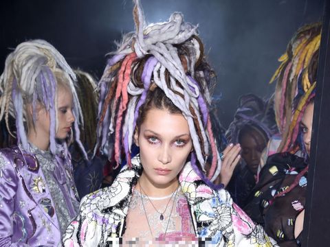 "THANK YOU @themarcjacobs @kegrand @bitton ❤️❤️❤️❤️❤ What an amazing collection!!! Thank you thank you thank you !!! @MARCJACOBS SS17," tulis Bella Hadid di belakang panggung dengan rambut gimbal warna-warni di kepalanya.