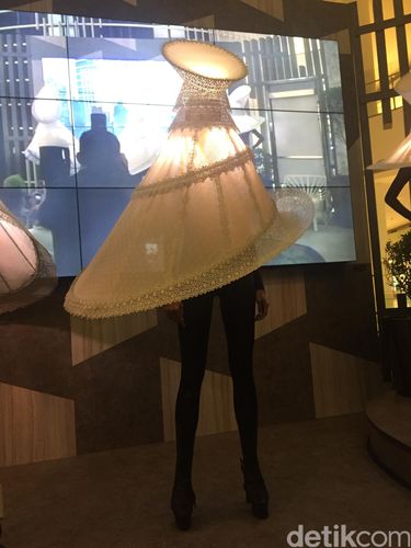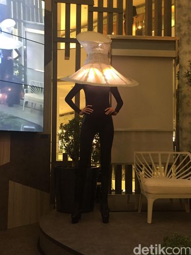 Ia lalu mengkreasikan bahan tersebut menjadi sebuah headpiece yang hasil akhirnya menyerupai kap lampu yang mewakili unsur interior. "Butuh waktu 1,5 bulan untuk membuatnya," kata Yung Yung.