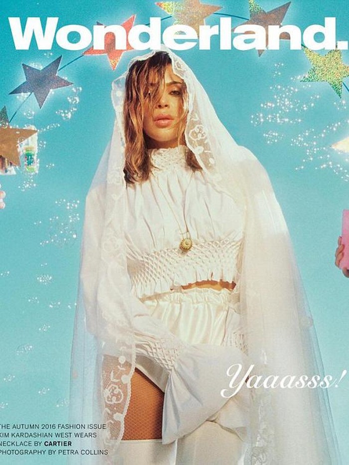 Foto-foto unik dari Kim ini adalah bagian dari pemotretan editorialnya untuk majalah Wonderland terbaru. Pada sampul majalahnya, Kim menjadi seorang pengantin memakai atasan crop dan celana pendek dari label Kenzo, lengkap dengan veil.