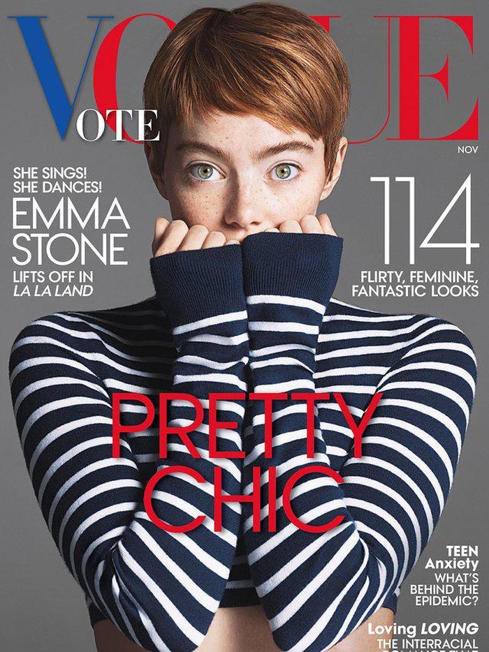 Emma Stone tampil sebagai bintang di cover Vogue bulan November 2016. Kehadirannya tak hanya sebagai model, namun bercerita tentang proyek terbarunya di film La La Land bersama Ryan Gosling juga Lupita Nyong'o.