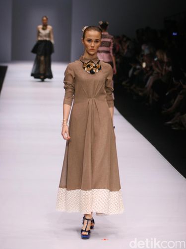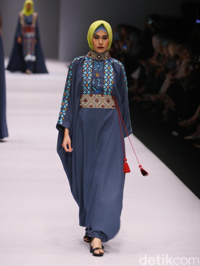 "Masih tetap abaya dan handcraft bordiran. Kali ini warna-warnanya lebih warna tanah ya, cokelat, biru, hijau, dan materialnya tetap ada twill, linen, katun juga," jelas Vivi dalam konferensi pers Jakarta Fashion Week 2017 di Senayan City, Jakarta Pusat, Selasa (25/10/2016).