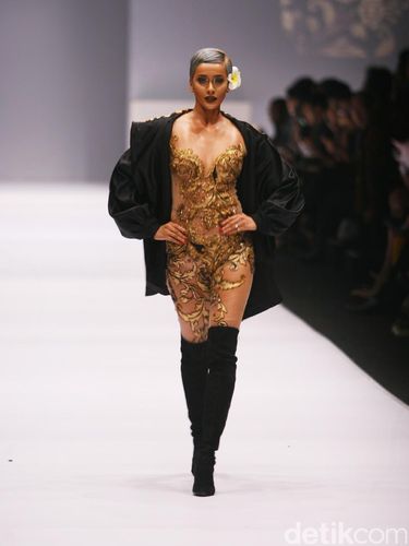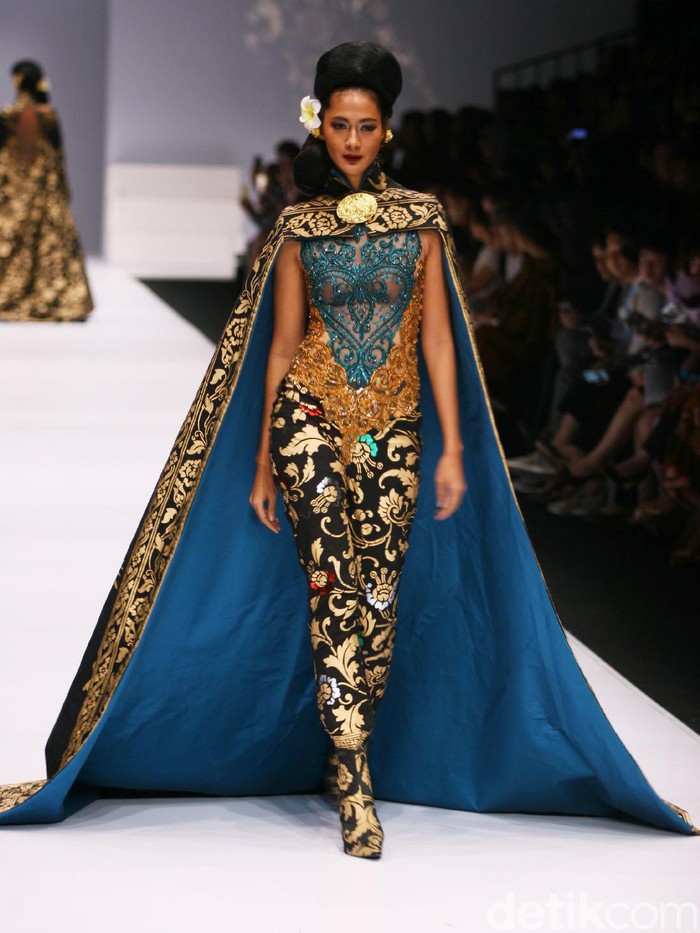 Jumpsuit brokat dan batik menghiasi sekuen terakhir. Inspirasi budaya Barat juga tampak dari penerapan jubah, tube dress, hingga cape dress. Terlihat pula sebuah romper brokat emas yang dipadukan dengan jaket batik. Peragaan spektakuler ini ditutup dengan kebaya dan bawahan batik bersiluet ballgown yang dipadukan selendang batik berukuran besar. (ami/hst)