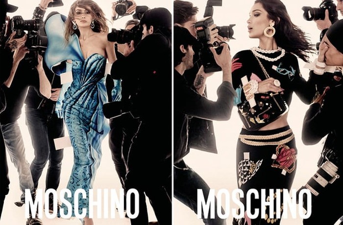 Untuk Moschino, dua model bersaudara ini memakai busana yang diadaptasi dari boneka kertas atau paper doll. Gigi memakai gaun biru dengan ruffle besar di salah satu lengan, sementara adiknya, Bella dengan gaun strapless warna peach.
