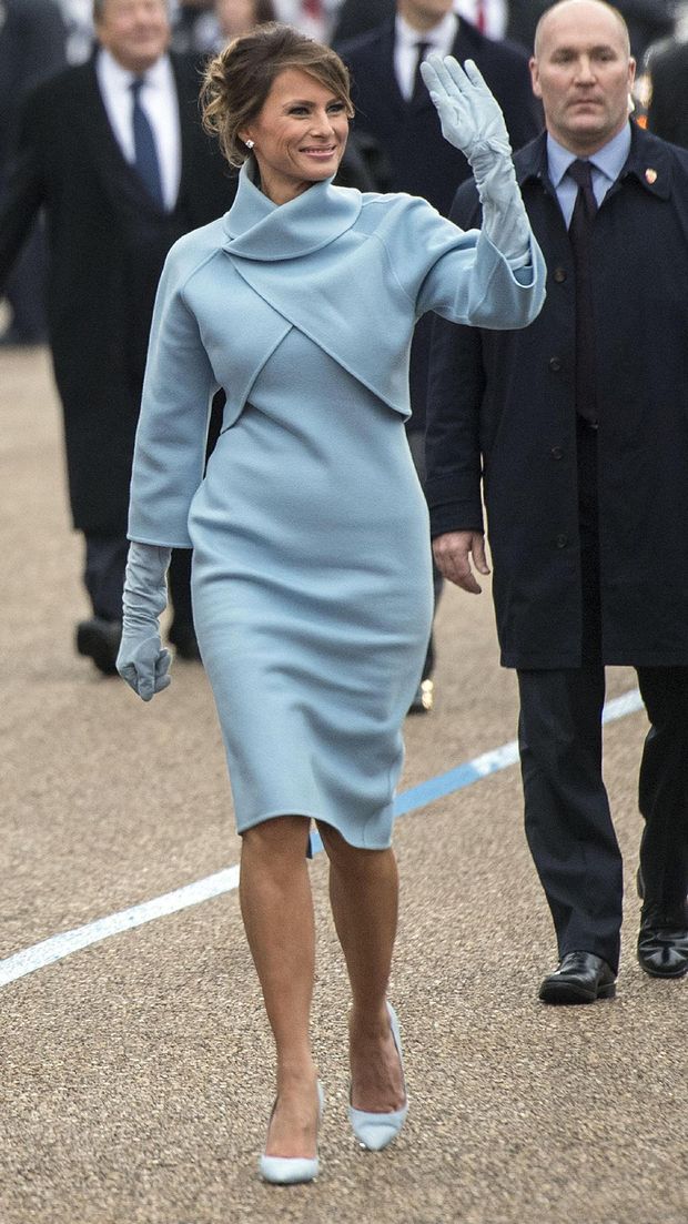 Untuk momen bersejarah tersebut, Melania mengandalkan busana rancangan Ralph Lauren, salah seorang desainer kebanggaan AS. Busana berwarna biru lembut itu terdiri dari sheath dress serta jaket berpotongan bolero yang tampil elegan dengan kerah tinggi.
