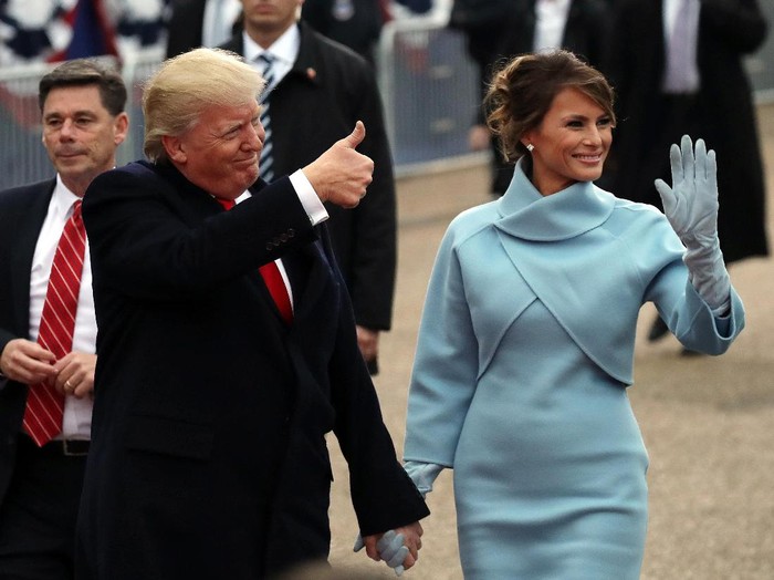 Mantan model asal Slovenia itu menyempurnakan gayanya dengan sarung tangan dan pointed heels berwarna senada. Melania yang dikenal dengan gaya elegan dan berkelas sukses memberikan gaya terbaiknya.