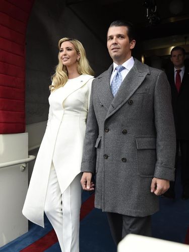 Setelan coat dan celana putih menjadi busana pilihan Ivanka untuk menyaksikan sumpah jabatan sang ayah sebagai presiden AS yang ke-45. Ivanka terlihat chic sekaligus fashionable dengan coat berpotongan asimetris rancangan Oscar De La Renta.