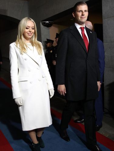 Kompak dengan sang kakak, Tiffany juga memilih busana warna putih saat inaugurasi. Wanita 23 tahun ini mengenakan coat model double-breasted putih yang dipadu gaun berwarna senada serta sepatu boot hitam.