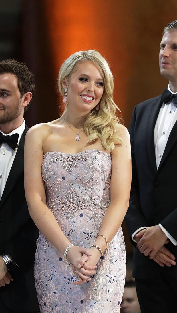 Malam inaugurasi, putri dari pernikahan kedua Donald Trump dengan Marla Maple ini tampil lebih glamor dengan strapless dress ungu motif floral, yang diberi aksen bebatuan. Ia tampak mengenakan satu set perhiasan seperti anting, kalung, gelang serta cincin.