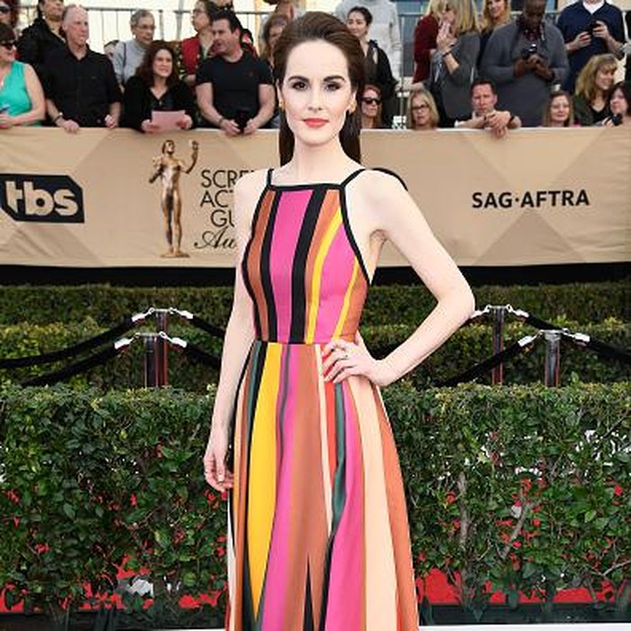 Gaun dengan motif garis vertikal dengan kombinasi warna juga diaplikasikan Michelle Dockery. Aktris serial Good Behavior tersebut memilih busana keluaran Elie Saab. Penampilan Michelle dengan dress multiwarna itu pun semakin meriah dengan aksesori bernuansa oranye dan lipstik merah.