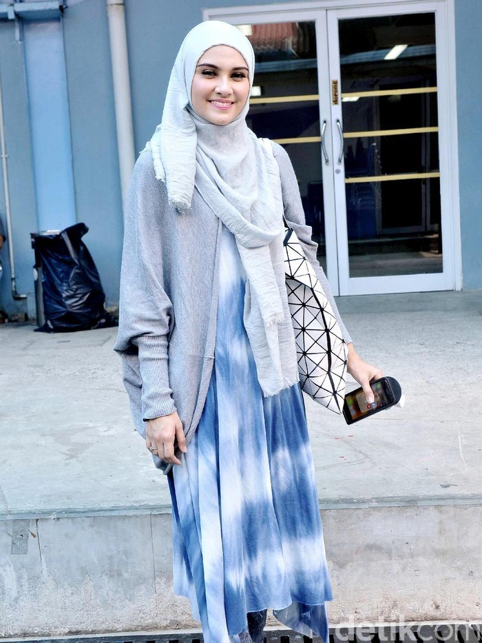 Ia hadir dalam balutan blouse garis-garis yang dipercantik dengan aksen temali di bagian bawahnya. Blouse itu dipadukannya dengan rok flare panjang dan hijab serba hitam. Sementara itu sentuhan jenaka hadir berkat warna biru tas Chanel yang ditentengnya.
