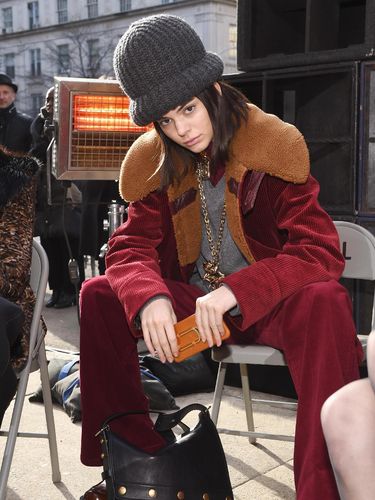 Sementara saat berjalan untuk Marc Jacobs, Kendall memeragakan busana dingin bergaya retro yang terdiri dari celana cutbray dan mantel merah marun dengan padanan kupluk abu-abu berukuran besar.