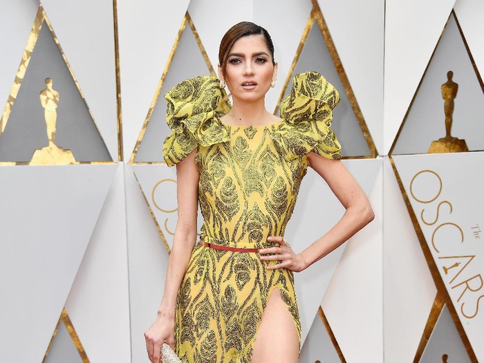 Gaun kuning memiliki banyak penggemar di tahun ini. Namun ketika gaun dalam warna cerah itu diberi lengan puffy yang besar, motif, belt tipis warna merah yang kontras dan belahan super tinggi, hasilnya gaun kuning ini pun tampil berlebihan.