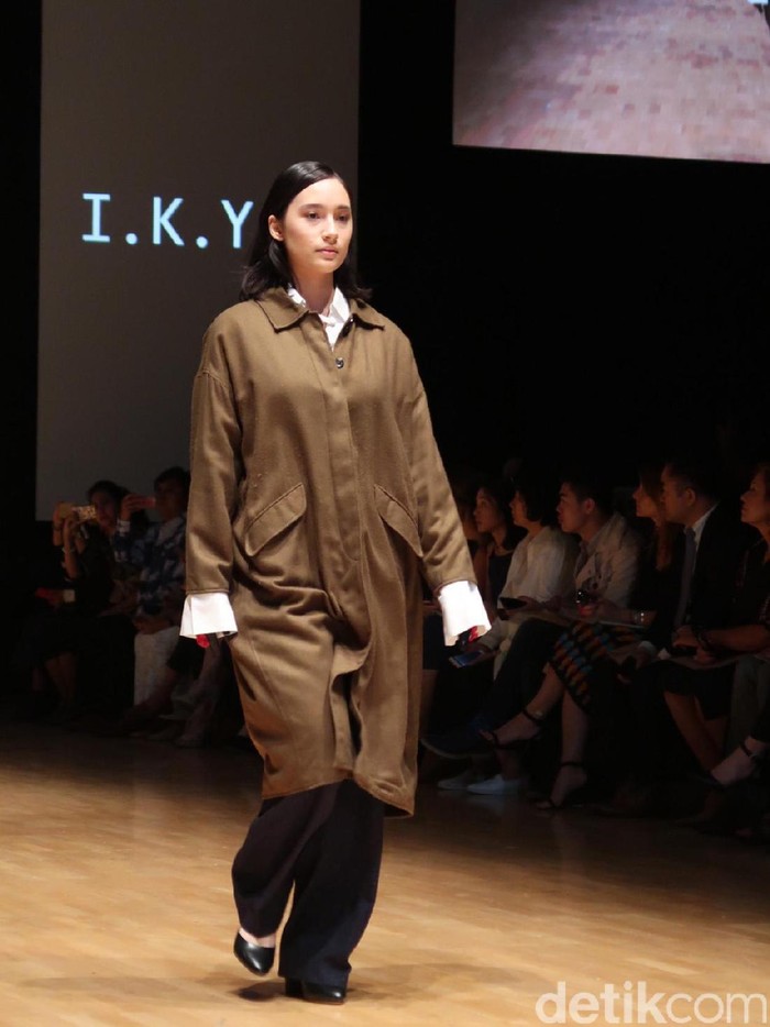 Aktris 19 tahun ini hadir sebagai salah satu model yang membawakan koleksi teranyar I.K.Y.K berjudul Bumi. Ia tampil dengan kemeja berlengan oversized dan coat panjang berpalet warna tanah.