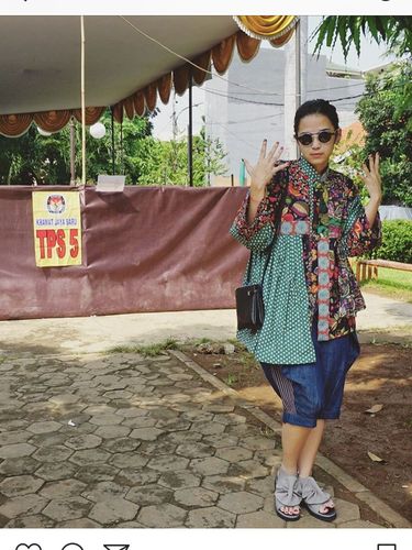 Ikut mencoblos, Dinda tampil dengan gaya quirky. Ia mengenakan blouse A-line tabrak motif floral dan polkadot, serta jeans 3/4 yang bervolume. Berikut sendal platform abu-abu yang dipercantik dengan pita.