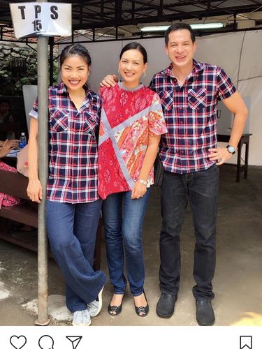 Ari dan istrinya, Inge Anugrah, memilih tampil kompak dengan kemeja kotak-kotak dan jeans. Sementara kakaknya, Ira, mengenakan atasan bermotif batik dan tenun.