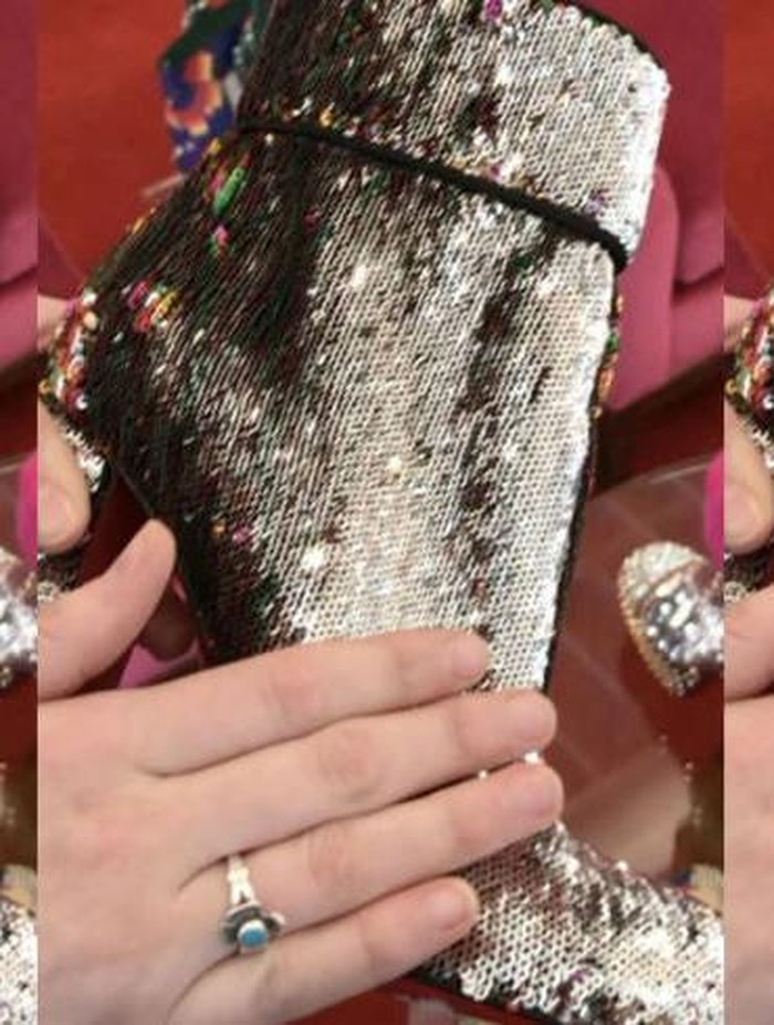 Tampak sepatu bergaya high-heeled boot tersebut hadir dalam material payet berwarna emas yang mengilap. Tidak ketinggalan dengan sol merah Louboutin yang legendaris itu.