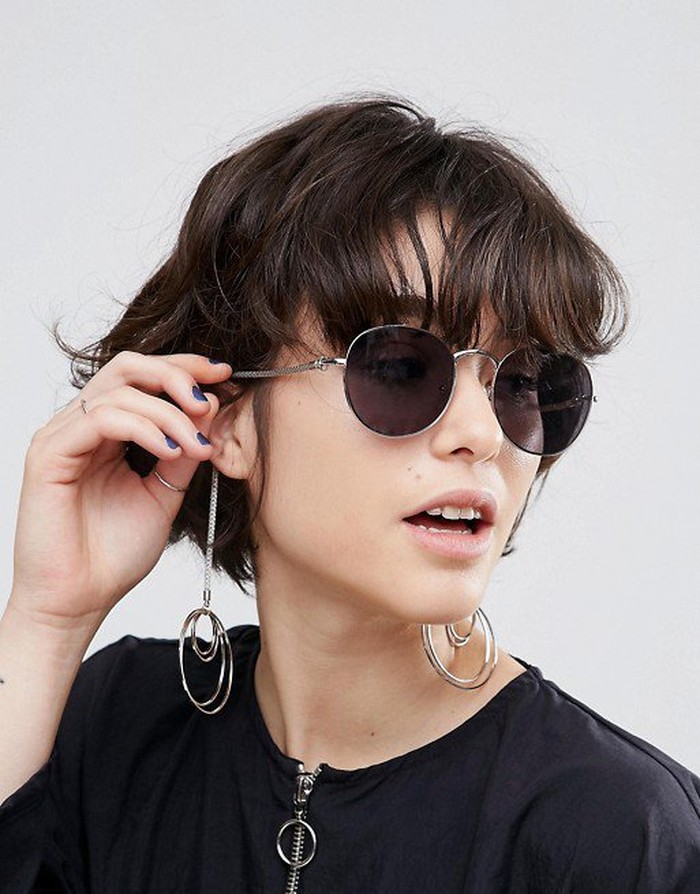 Kacamata itu tampaknya memang sengaja dibuat lain dari pada yang lain. Sepertinya agar kacamata tersebut terlihat lebih modis dan inovatif, Asos mengganti tangkainya dengan material rantai yang lebih fleksibel. Rantai itu pun dihadirkan panjang dengan bandul serupa hop earring di bagian bawahnya. Tampaknya item tersebut mencoba menggabungkan fungsi kacamata dan anting. Cukup aneh, bukan?