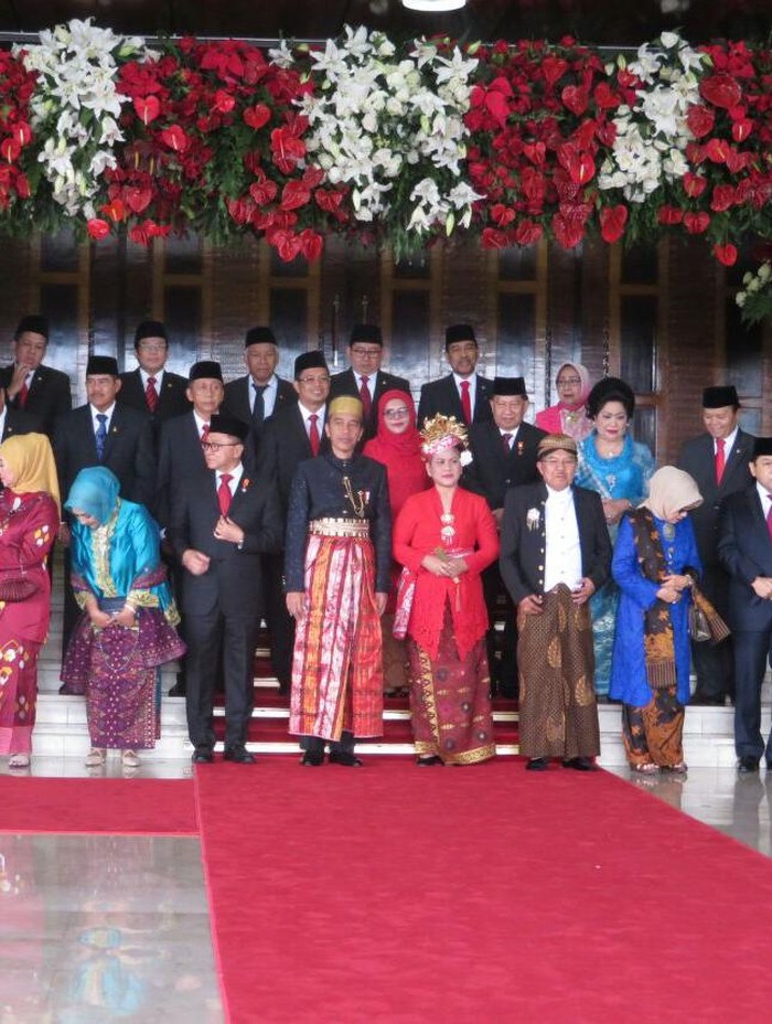 Jokowi menggunakan baju adat Bugis & songkok Recca. Iriana memakai baju adat Bali Foto: Jokowi-JK pakai baju adat. (Andhika Prasetia/detikcom)