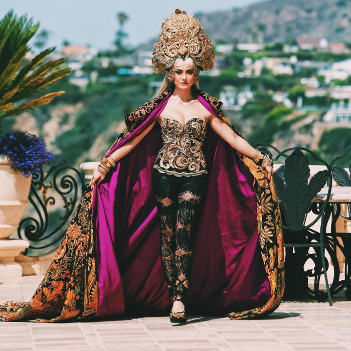 Penyanyi berusia 30 tahun tersebut terlihat mengenakan bustier bermotif yang dipadu legging serta jubah bermotif batik. Agnez MO juga mengenakan mahkota keemasan. Tak lupa, sepatu hitam dengan aksen batik pada ujungnya melengkapi keseluruhan busana.