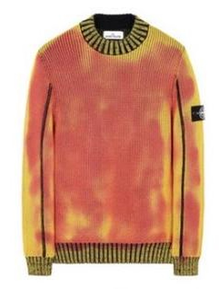 Stone Island menawarkan tiga pilihan kombinasi warna sweater untuk koleksi ini, antara lain kuning-oranye, hijau zamrud-hijau tentara, putih gading-abu gelap.