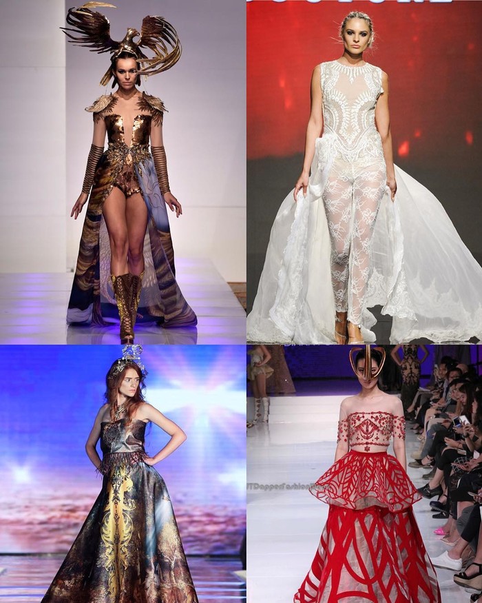 Pemilik label 'Diana Couture' itu mendominasi karyanya dengan sentuhan keemasan. Tambahan aksesori pada kepala hingga sayap Garuda dipamerkan Diana Putri di LAFW. Salah satu contohnya, mini dress berbahan lace yang ditambah sayap garuda lebar keemasan di belakangnya. Belum lagi headpiece emas di atas kepala sang model.